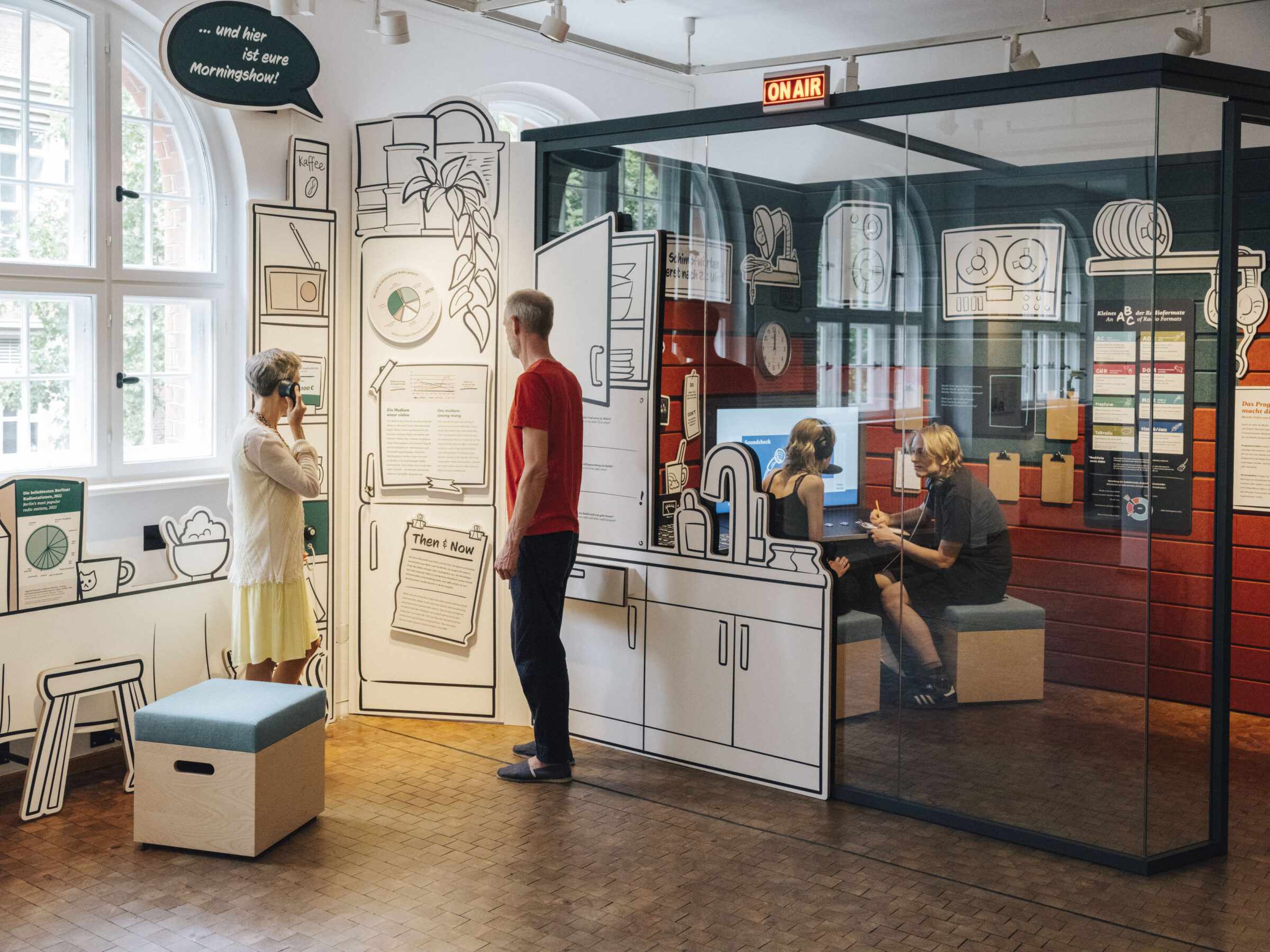 In der neuen Dauerausstellung zur Nachrichtentechnik im Deutschen Technikmuseum Berlin können Besuchende jetzt selbst kurze Radio-Sendungen produzieren und live „On Air“ gehen: Sie können ein Fußballspiel kommentieren oder die Nachrichten einsprechen, einen Song anmoderieren oder ein kleines Hörspiel produzieren.